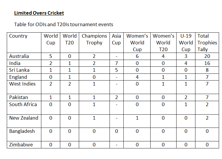 Limited Overs Tournaments Trophies Tally Table for Established International Cricket Test Playing Nations Abdullah Haider15th May 2019Uncategorized Post navigation Next Share this: Click to share on X (Opens in new window) X Click to share on Facebook (Opens in new window) Facebook Like Loading... Related
