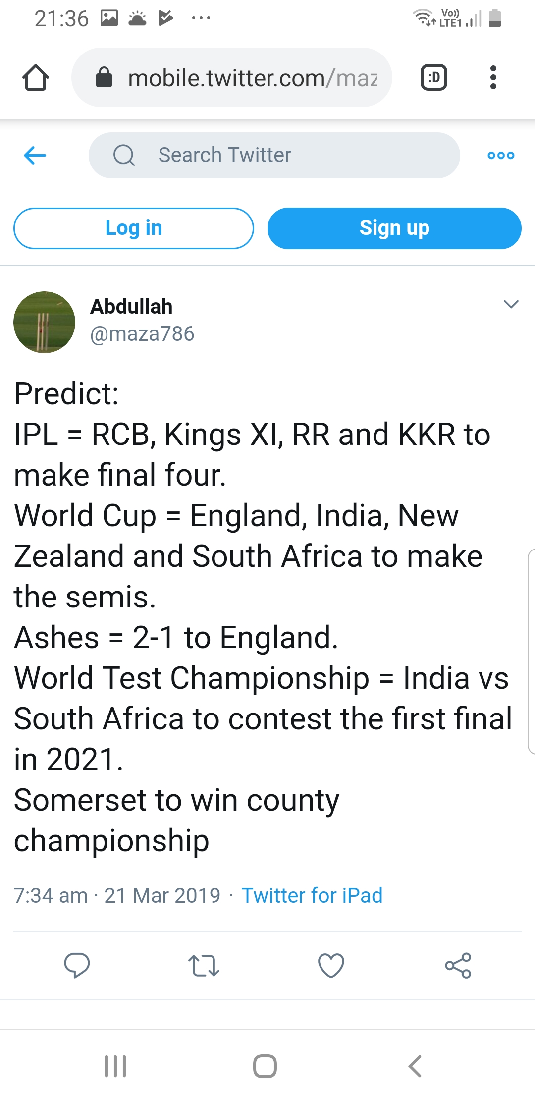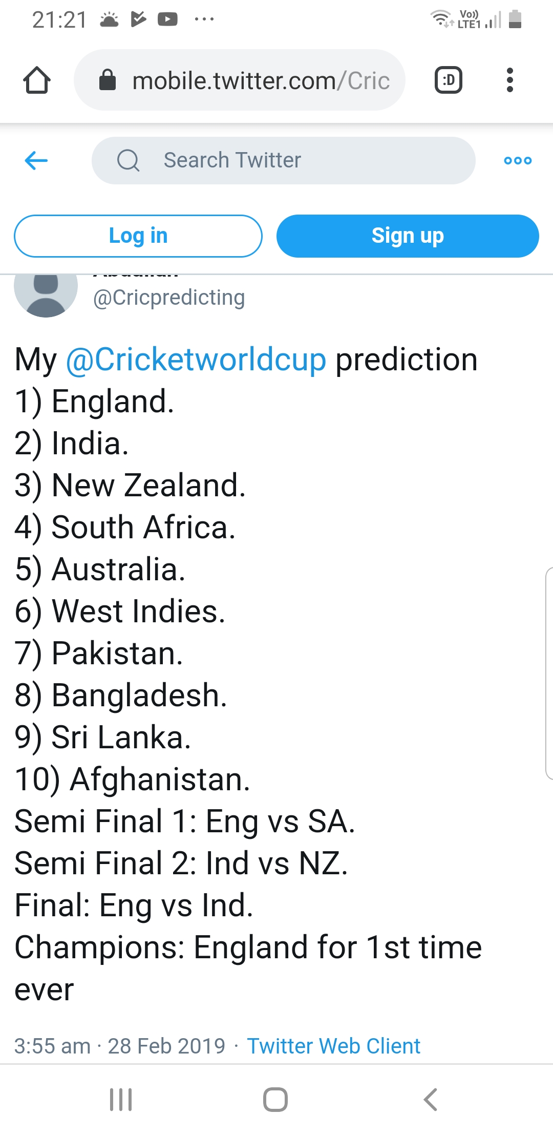 England Winning 2019 World Cup Predictions by Abdullah on Twitter Before The Tournament Abdullah Haider12th Aug 201912th Aug 2019Uncategorized Post navigation PreviousNext Share this: Click to share on X (Opens in new window) X Click to share on Facebook (Opens in new window) Facebook Like Loading... Related
