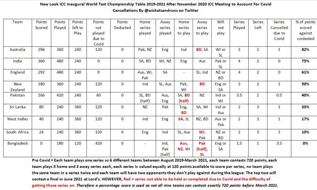 How the Inaugural ICC World Test Championship Table Will Look With The Two Solutions Currently Being Considered By ICC For Cancelled Series Abdullah Haider1st Nov 202015th Nov 2020TestCricket, World Test Championship Post navigation PreviousNext The race to Lord’s 2021 is on ………… Share this: Click to share on X (Opens in new window) X Click to share on Facebook (Opens in new window) Facebook Like Loading... Related