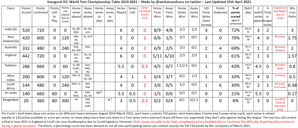Neither India or New Zealand played a Test series in England during the course of the World Test Championship league stages.